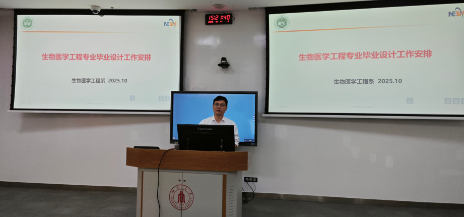 在基教 C102 召开本科毕业论文培训会。全体参与本科毕业论文指导工作的教师参会,旨在规范毕业论文各环节工作,明确质量要求,为顺利完成本科人才培养及配合本科教学审核评估筑牢基础。会议由生物医学工程系主任杨为中主持。